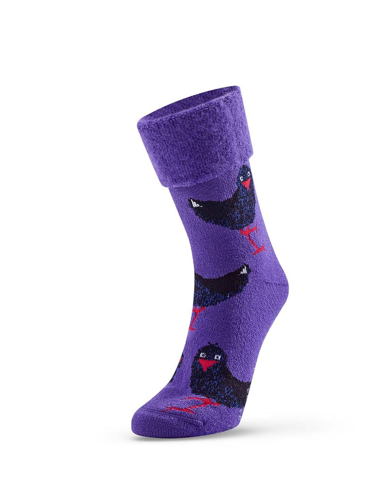 Cosy, fluffy and so soft these gorgeous bed socks will quickly become a favourite for not only the cold nights, but days too. A little fun and quirky they are covered in a NZ Pukeko with a choice of either Emerald or Purple. A midweight full cushion crew socks with non-slip grips on soles. Size is OSFM. Made in NZ.