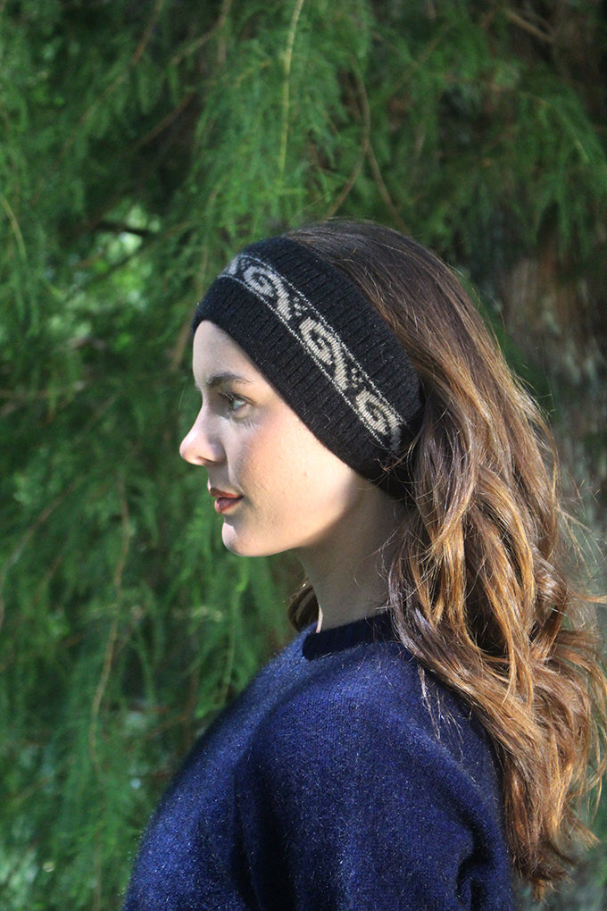 A single thickness headband in a 2x1 rib knit with a koru motif in a contrasting colour. Available in one size only.